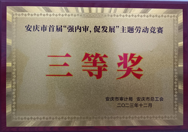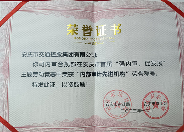 1月26日,安慶市首屆“強(qiáng)內(nèi)審,促發(fā)展”主題勞動競賽頒獎儀式在市審計(jì)局舉行。市交控集團(tuán)內(nèi)審合規(guī)部榮獲履行內(nèi)部審計(jì)職責(zé)類競賽項(xiàng)目三等獎及內(nèi)部審計(jì)先進(jìn)機(jī)構(gòu)榮譽(yù)稱號。