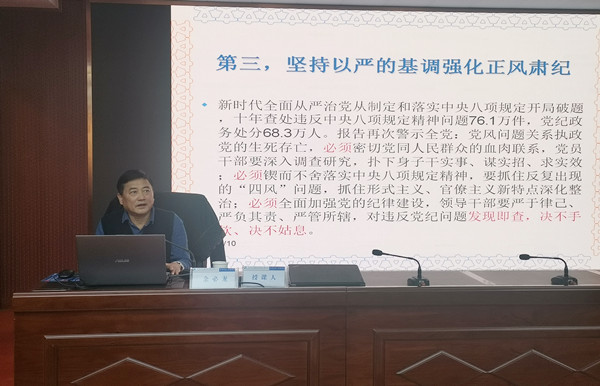 余必龍以《從扣好廉潔從政的“第一??圩印弊銎稹窞轭},圍繞黨的二十大全面從嚴(yán)治黨戰(zhàn)略要求,進(jìn)一步深化八項規(guī)定實施細(xì)則,引入典型案例進(jìn)行剖析,指出黨政機(jī)關(guān)國企工作人員不可觸碰的紅色底線,以案釋法講述“勿以惡小而為之、勿以善小而不為”,提升干部職工對廉潔價值理念的認(rèn)同感,警醒全體員工牢記紀(jì)律規(guī)矩,知敬畏、存戒懼、守底線,在思想上、工作上、生活上、學(xué)習(xí)上、監(jiān)督上做到廉潔自律,進(jìn)一步提高政治站位,從嚴(yán)落實中央八項規(guī)定精神, 增強(qiáng)政治自覺,持之以恒正風(fēng)肅紀(jì),推動廉政教育走深走實、入腦入心,不斷擰緊全員廉潔思想“總開關(guān)”,打造風(fēng)清氣正的廉潔從業(yè)環(huán)境。