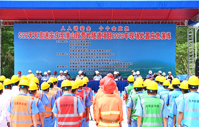 6月21日上午, 2023年安慶市交通建設(shè)工程安全應(yīng)急演練在S22天天高速營(yíng)嶺隧道項(xiàng)目拉開(kāi)序幕。